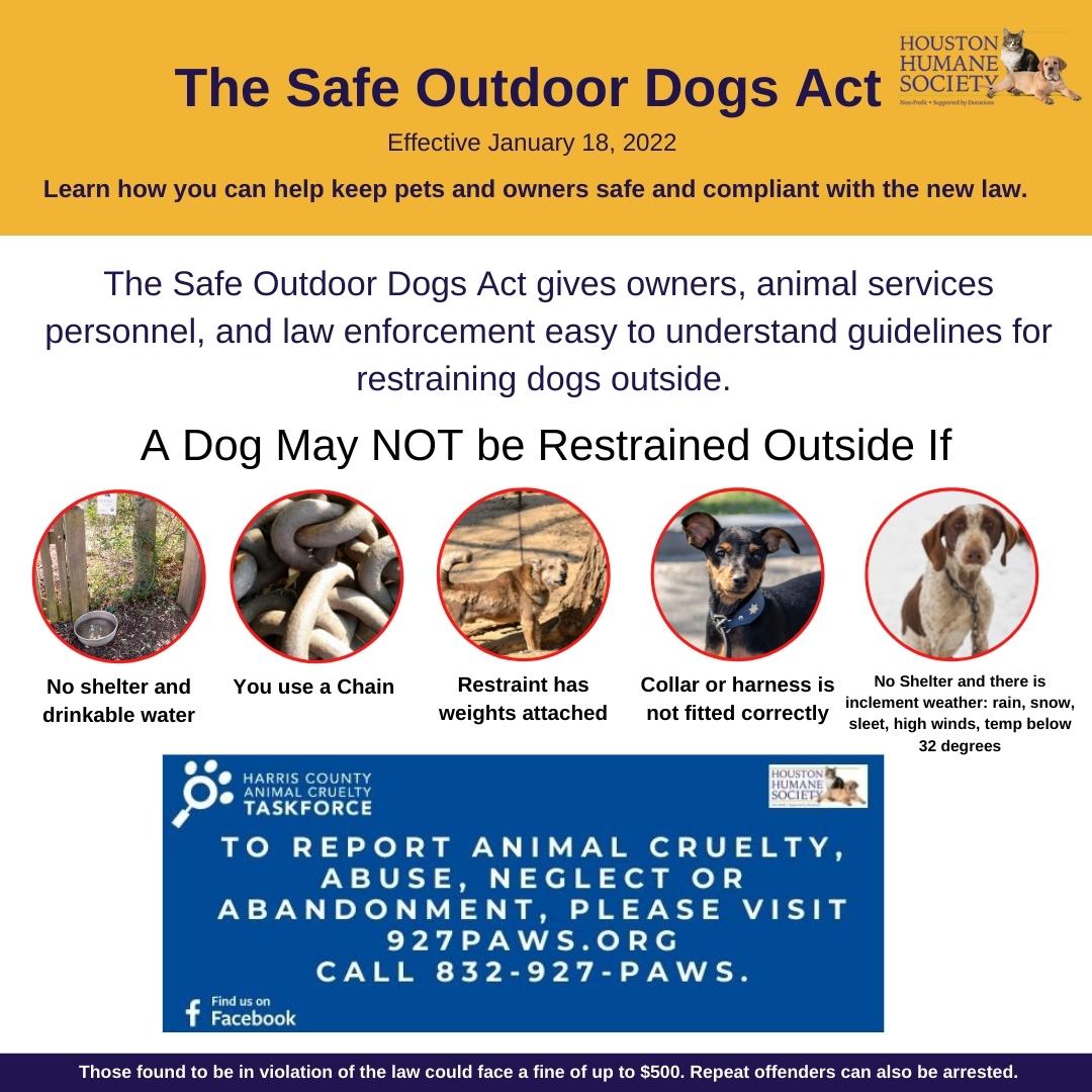 In 2021, the Texas Legislature passed SB 5 - the Safe Outdoor Dogs Act - to protect unattended dogs restrained outdoors.