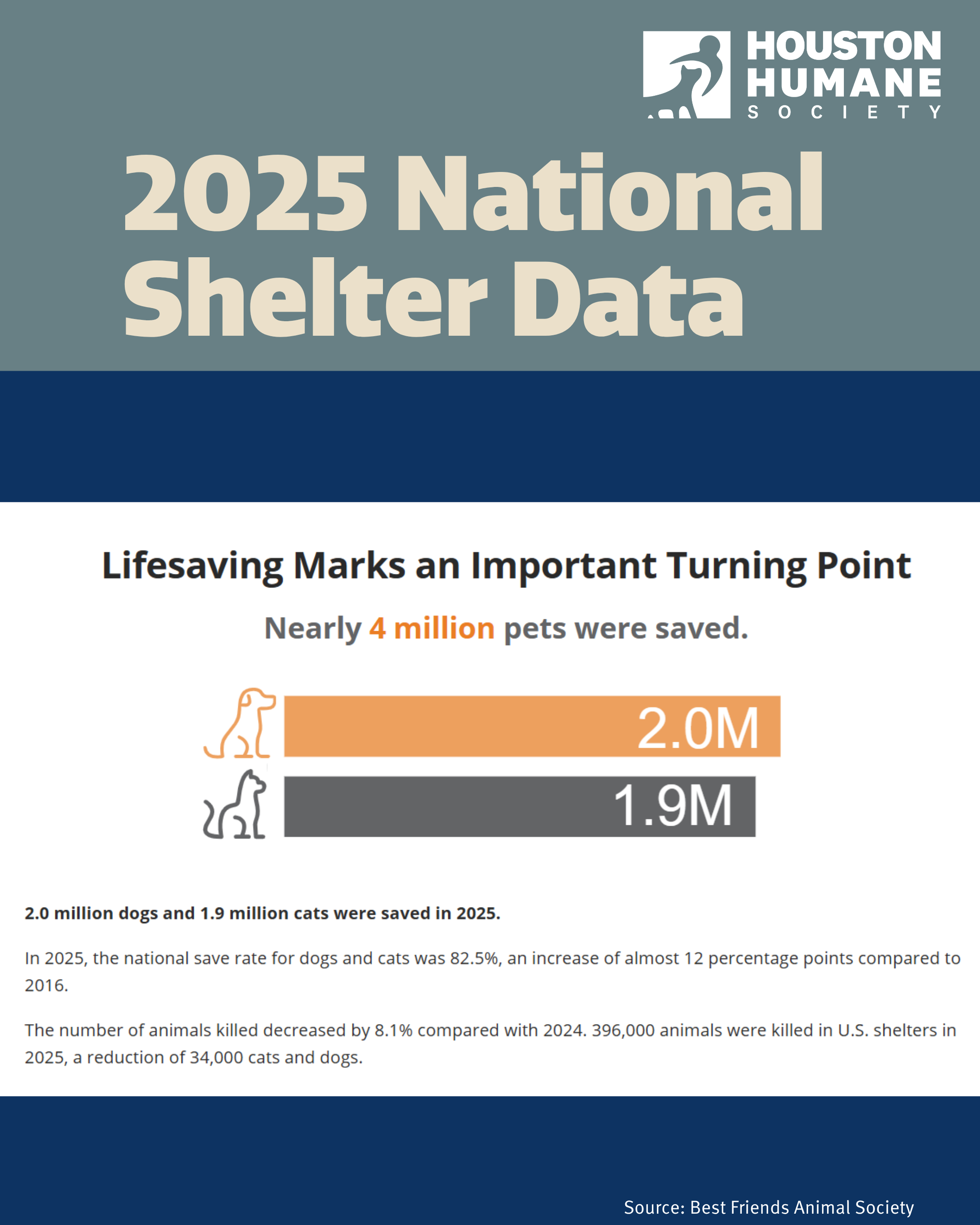 Houston Humane Society is at the forefront of this fight to significantly decrease euthanasia in our community, achieving a 93% total save rate in 2025. Houston Humane also is committed to saving lives and decreasing the number of dogs and cats euthanized all along the Gulf Coast of Texas.