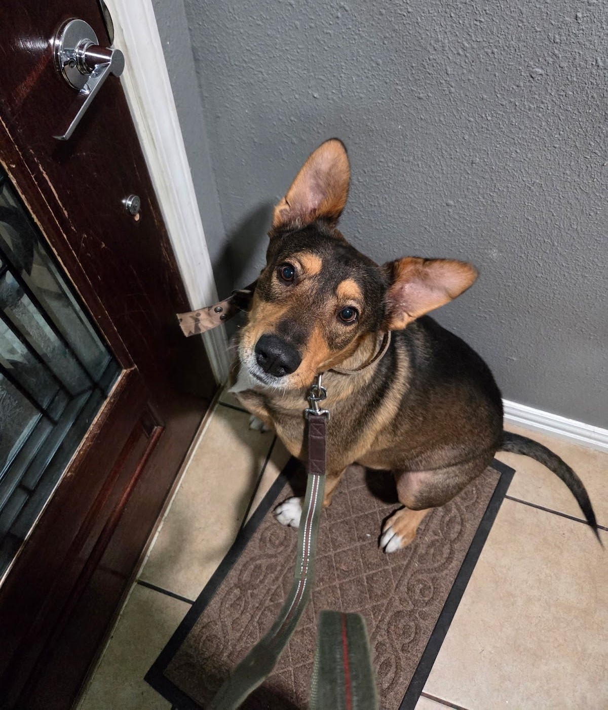 She would do best in a home without cats, as she has a strong interest in chasing them, and she prefers being guided gently on leash rather than being handled by the collar. Baths are not her favorite activity, but she handles them like a champ, especially when they are warm and indoors.