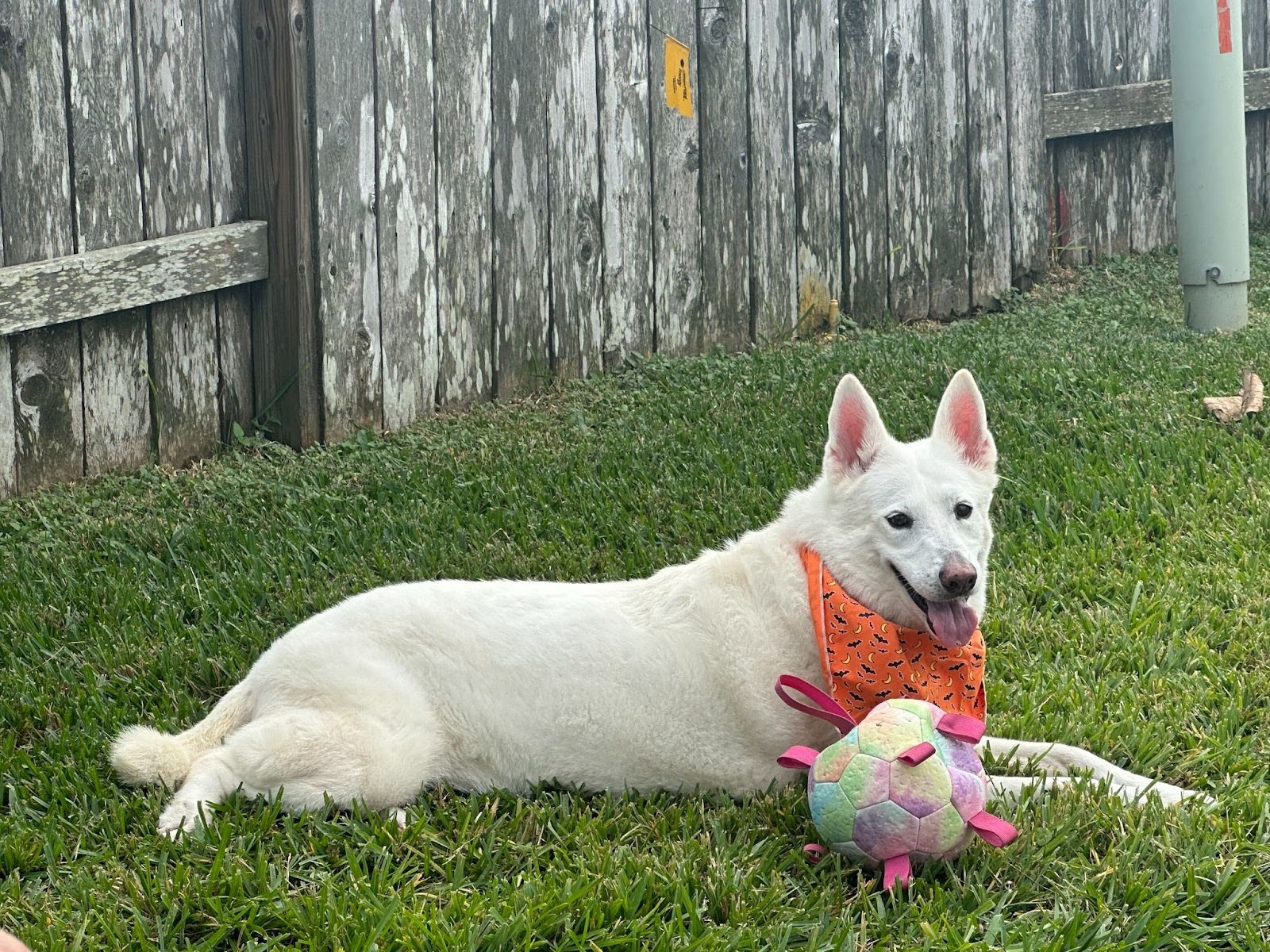 She now enjoys her daily walks, at least twice a day, playing fetch, wearing costumes, visiting parks, and going on our outings and shopping trips to local pet stores. She also, of course, has a large collection of tennis, squeaky, soccer, and other balls since we know that’s her favorite kind of toy.