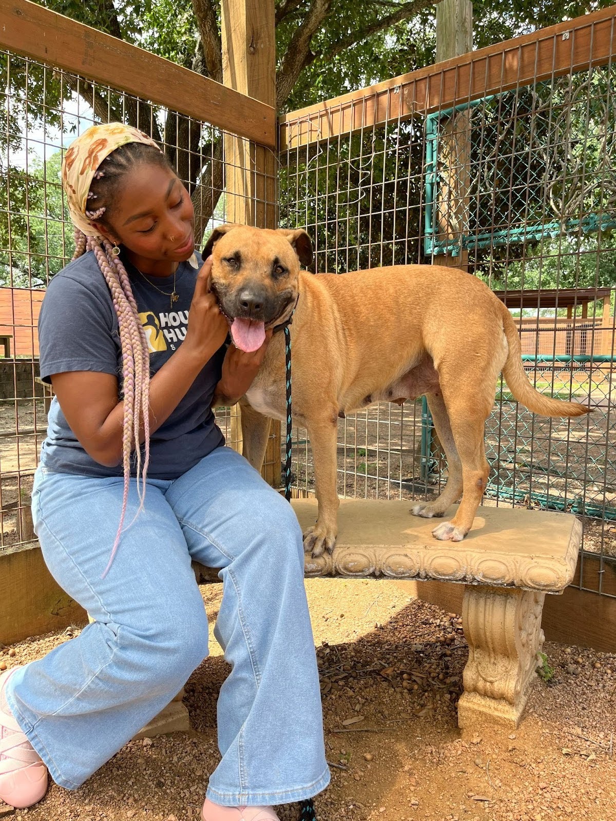 Our volunteers adore her, and it’s easy to see why. You can often find them sitting out in the play yard with Sunshine, relaxing together in the grass and enjoying the moment. She has a calm, comforting energy that makes spending time with her feel easy.